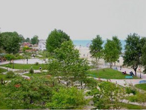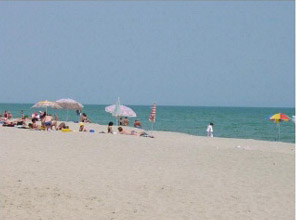 Αμμώδης ακτή, εκτείνεται σε μήκος αρκετών χιλιομέτρων με λεπτή, καθαρή άμμο και ρηχή θάλασσα. Βραβεύεται κάθε χρόνο με την γαλάζια σημαία της Ευρώπης και κατακλύζεται κάθε καλοκαίρι από πολύ μεγάλο αριθμό τουριστών.