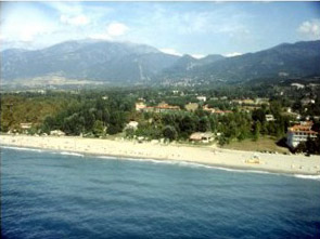 Ακτή με χρυσή άμμο, βραβευμένη με τη Γαλάζια σημαία της Ευρώπης, στους πρόποδες του Ολύμπου.